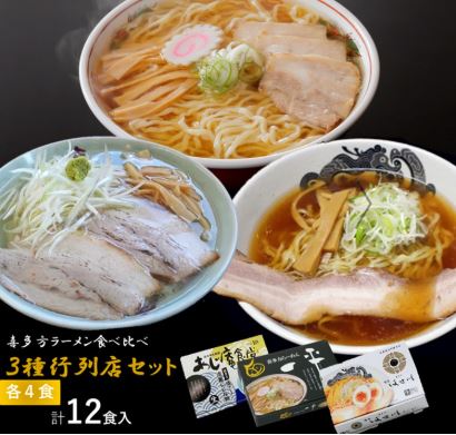 食堂はせ川:淡麗醤油中華そば4食、喜多方ラーメン一平:4食、あじ庵食堂:淡麗しじみ潮4食