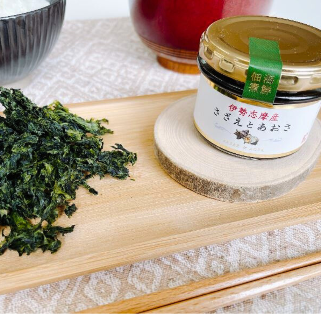 さざえとあおさ:伊勢志摩の海の恵みを受けて育った青さのりとサザエと使用し、素材の良さを活かした独自の製法で仕上げた佃煮です。ご飯のおとも・酒の肴にぴったりな「おとなの佃煮」です。化学調味料不使用の商品です。