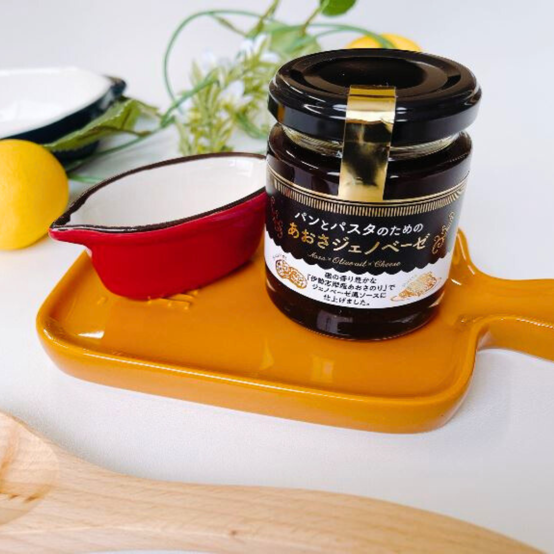 あおさジェノベーゼ:磯の薫り豊かな「伊勢志摩産青さのり」を使用し、エキストラバージンオリーブオイルとチーズなどでジェノベーゼ風に仕上げました。パンやパスタにおすすめのソースです。化学調味料不使用の商品です。