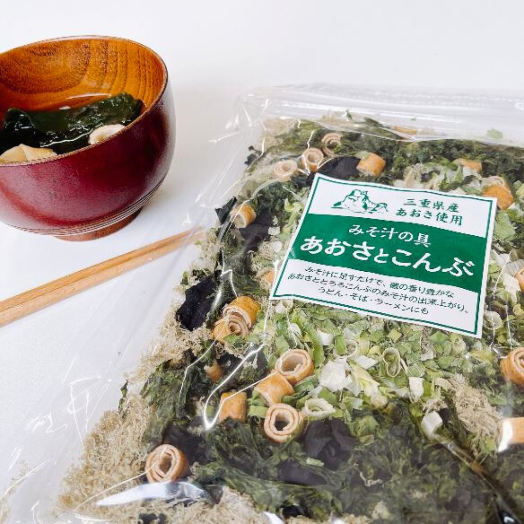 あおさとこんぶ:三重県産の青さのりと北海道産のとろろ昆布を使用しています。お味噌汁に一つまみ入れて頂くだけで、青さのりの香りととろろこんぶの旨さをお楽しみいただけます。