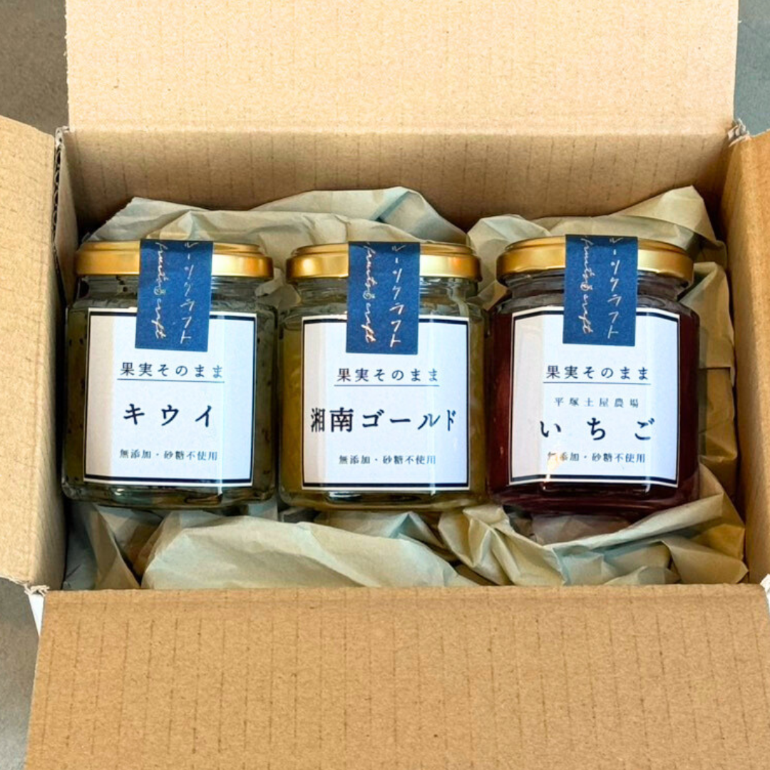 湘南フルーツクラフト人気商品「湘南ゴールドマーマレード」「いちごジャム」「キウイジャム」3種を詰め合わせにしました。気軽にお楽しみいただけるよう簡易包装でお届けします。