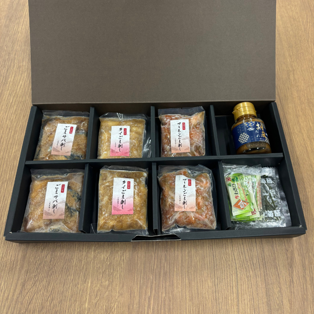 原材料等:真鯖(長崎県産又は福岡県産)、真鯛(福岡県産)、みらいサーモン(福岡県産)胡麻ダレ(醸造調味料(米・米麹の醸造調味料(国内製造)、醤油(アミノ酸液(国内製造)、食塩、脱脂加工大豆、小麦、その他)、すり胡麻、砂糖、胡麻ペースト)、刻み海苔、加工わさび(西洋わさび(中国産)、本わさび、植物油脂)/調味料(アミノ酸等)、酒精、カラメル色素、甘味料(サッカリンNa、甘草、ステビア)、ソルビット、香辛料、環状オリゴ糖、増粘多糖類、着色料(紅花黄、クチナシ)(一部に小麦・大豆、ごま・さば・さけを含む)